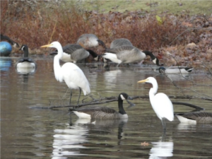 I took this picture in December a couple of years ago at the lake in our neighborhood in Yorktown, Virginia. The temperature was about 38 degrees that day. The white birds are great egrets, stopping over as they migrate south. The Canada geese may be migrating as well, although we have a lot who are year ’rounders here.